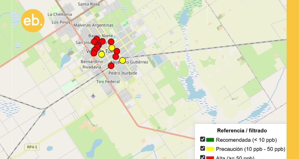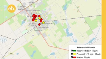 El Instituto Tecnológico de Buenos Aires (ITBA) actualizó su “Mapa de Arsénico en Argentina” y confirmó valores preocupantes en el sur santafesino. En Venado Tuerto, las muestras analizadas superan ampliamente los límites recomendados por la Organización Mundial de la Salud (OMS), con registros que llegan a los 100 partes por mil millones (ppb), cuando el valor máximo sugerido es de 10.